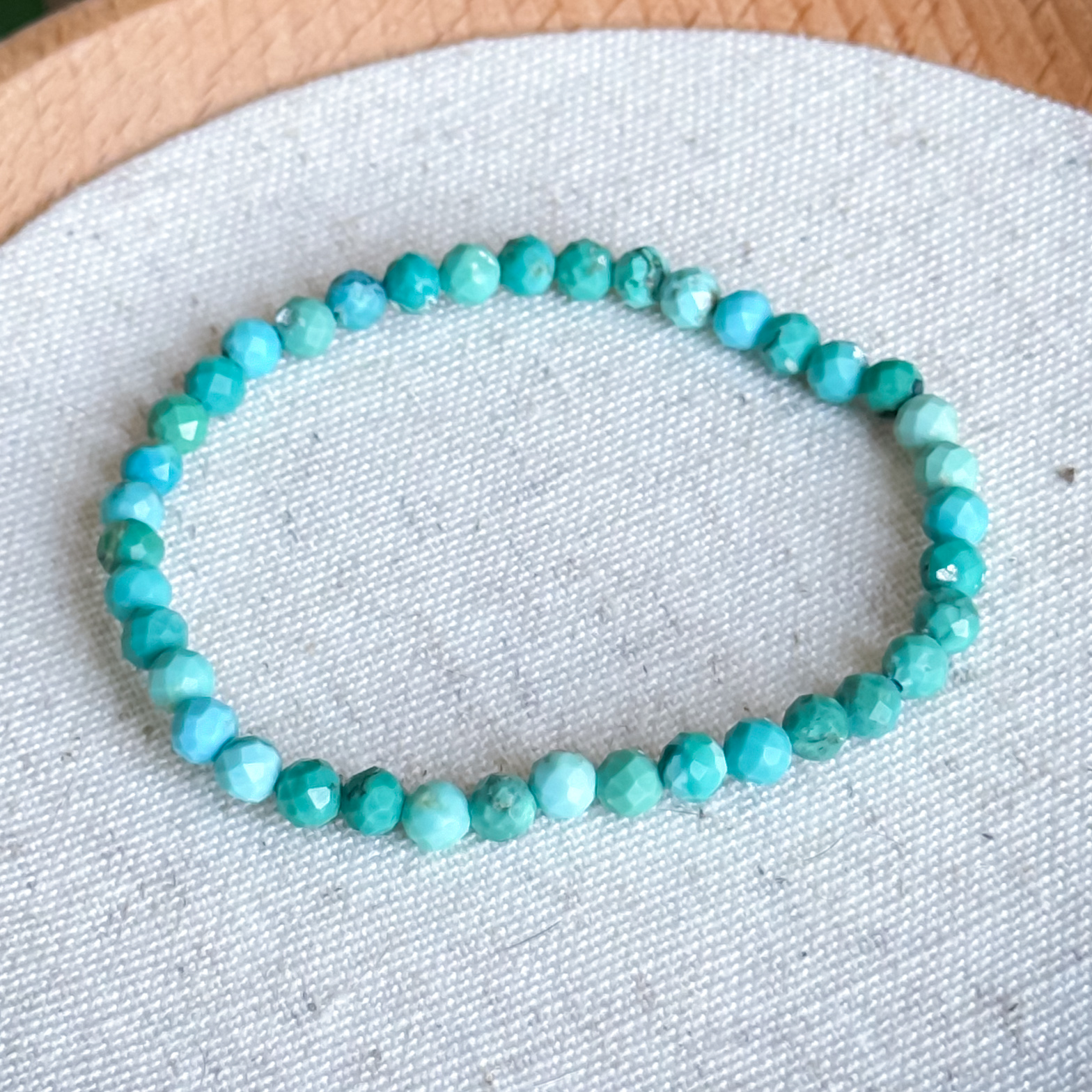 Measures 5–6 on the Mohs hardness scale — avoid water soaking, harsh chemicals, and impact, as turquoise is porous and can be easily affected.
