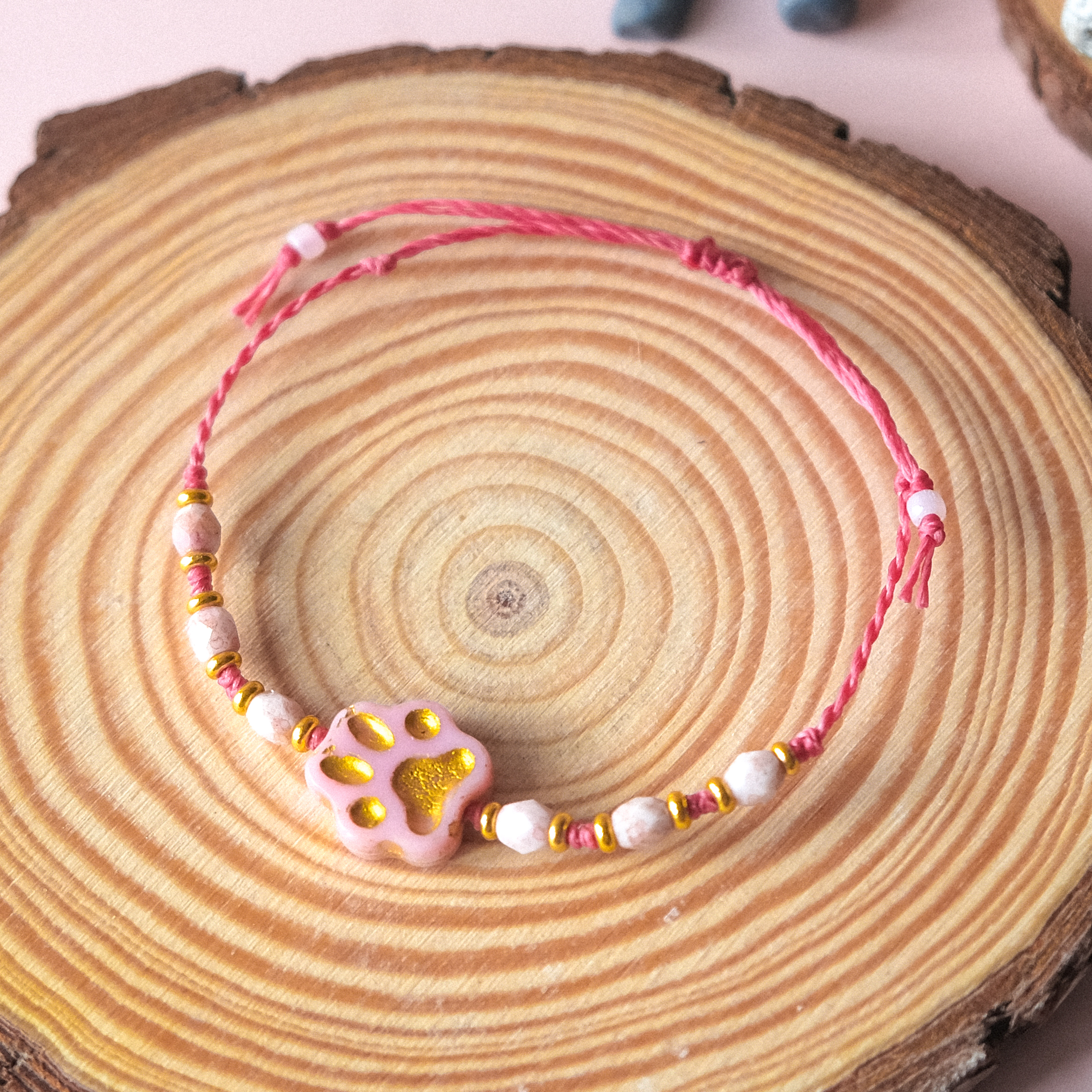 This handmade paw charm bracelet features delicate Czech and Japanese glass beads paired with a Linhasita waxed cord for durability and everyday comfort. Finished with a pastel paw charm accented in gold, it’s a subtle yet meaningful piece—perfect for pet lovers, gift-giving, or adding a playful touch to your stack.