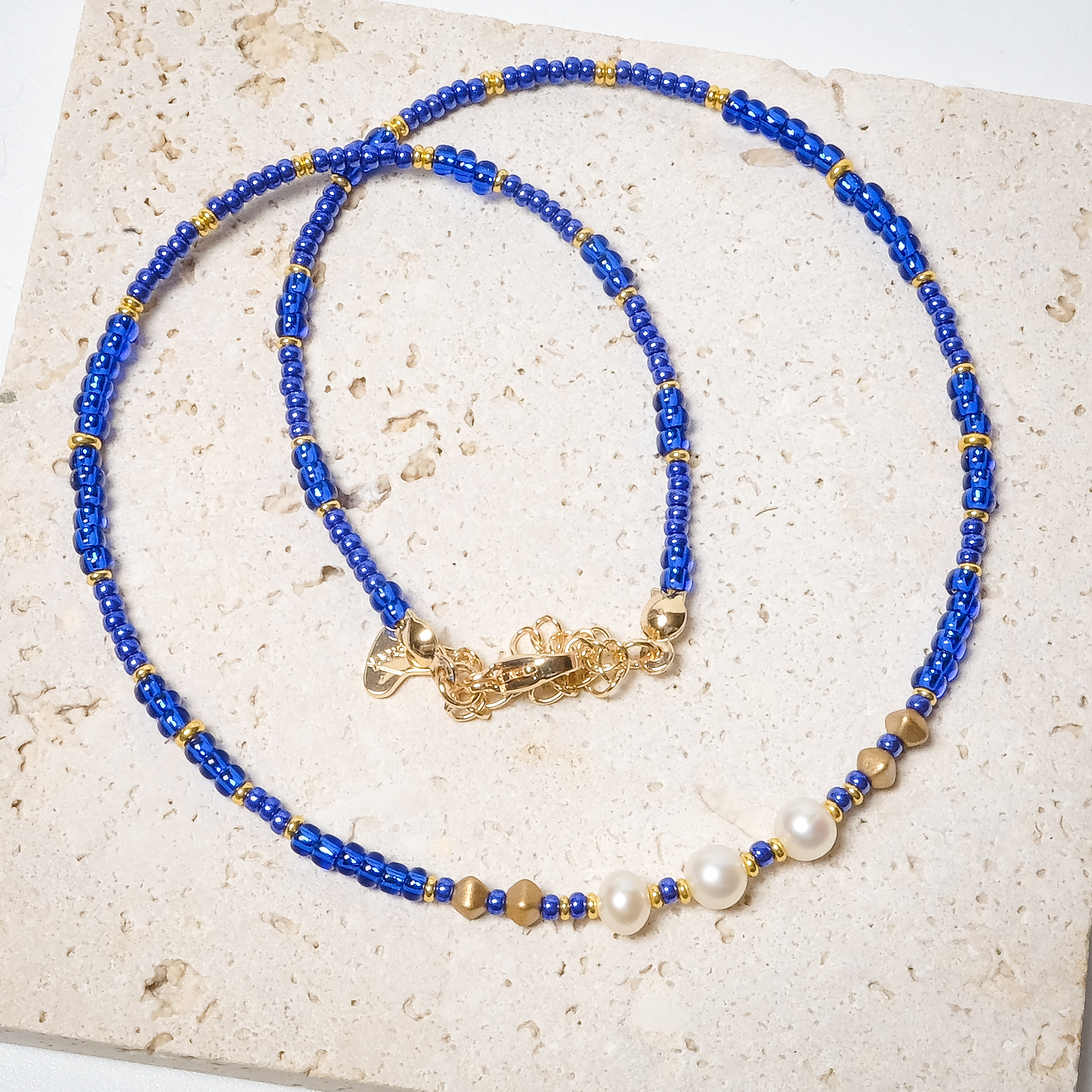 Bold, vibrant, and totally eye-catching! This stunning choker features three lustrous pearls paired with matte gold accent beads, all strung among rich cobalt blue seed beads with a gorgeous glossy finish. Gold accents pop beautifully against the deep blue tones for a look that’s equal parts classic and fun.